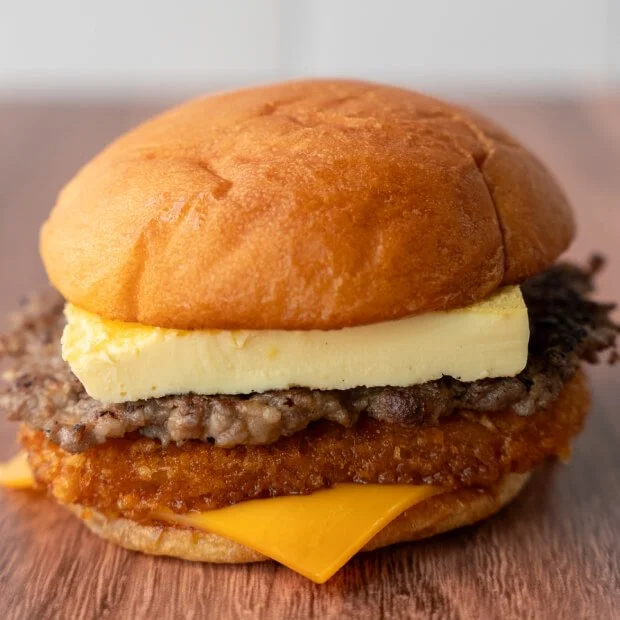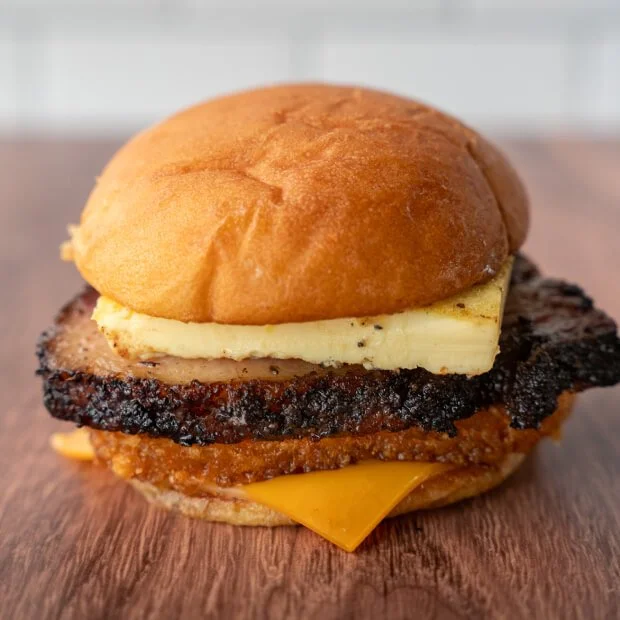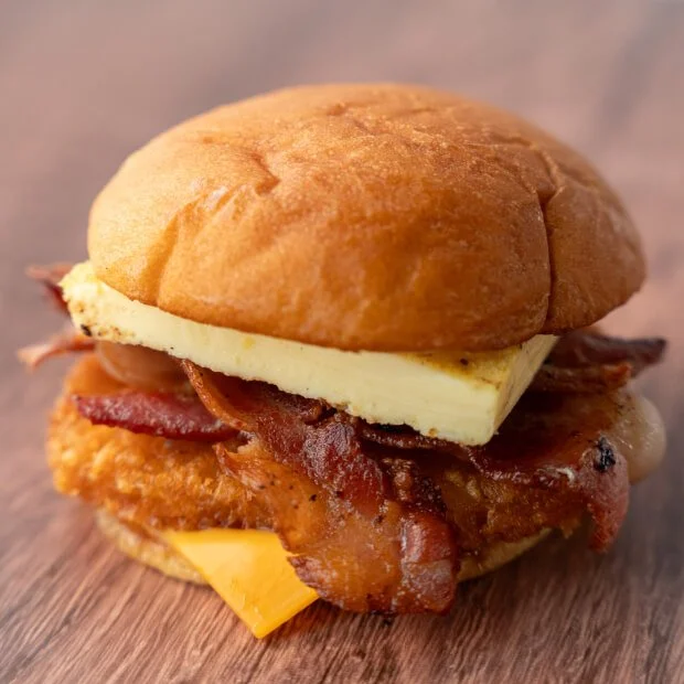 Toasted potato bun with thick-cut bacon, fluffy egg omelette, melty American cheese, hash brown, spicy ketchup on the side