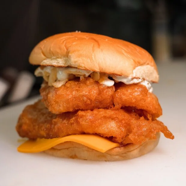 Shiner Bock beer-battered fish filet, American cheese, crushed kettle chips, and house-made tartar sauce on a toasted potato bun. Like that famous fast food chain’s fish sandwich but way better. Available for a limited time only.